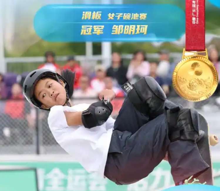 11日,十五运会滑板项目在广东惠州完赛,4枚金牌中的3枚被青少年选手获得,摘得奖牌的12人中有9人尚未成年。当天年龄最小的冠军产生在女子碗池,13岁的广东队选手邹明珂以0.32分的微弱优势反超12岁的山东队选手孟令妍夺冠。