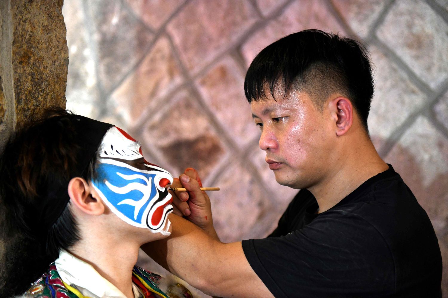 图为台湾青年面师庄俊益(右)16日正在绘制脸谱。(图/中新社)