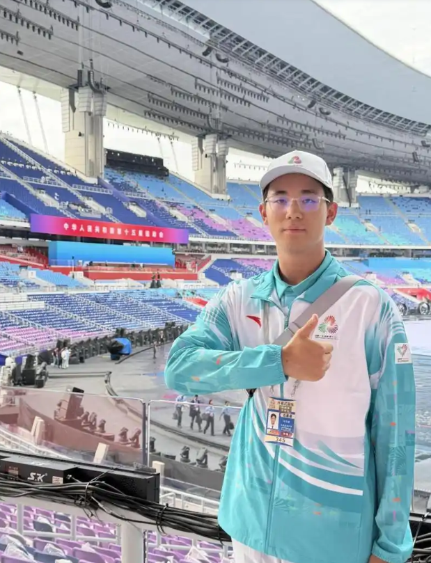 11月9日,十五运会青年志愿者黄俊瀚在开幕式现场。(图/北青网)