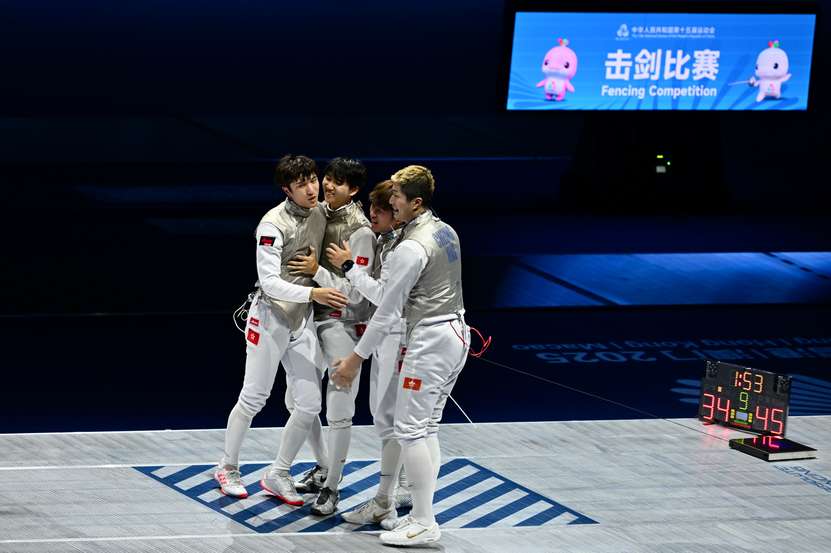十五运会击剑项目男子花剑团体金牌赛19日在香港启德体育园启德体艺馆举行。图为张家朗(右一)与队友庆祝香港队夺冠。(图/中新社)