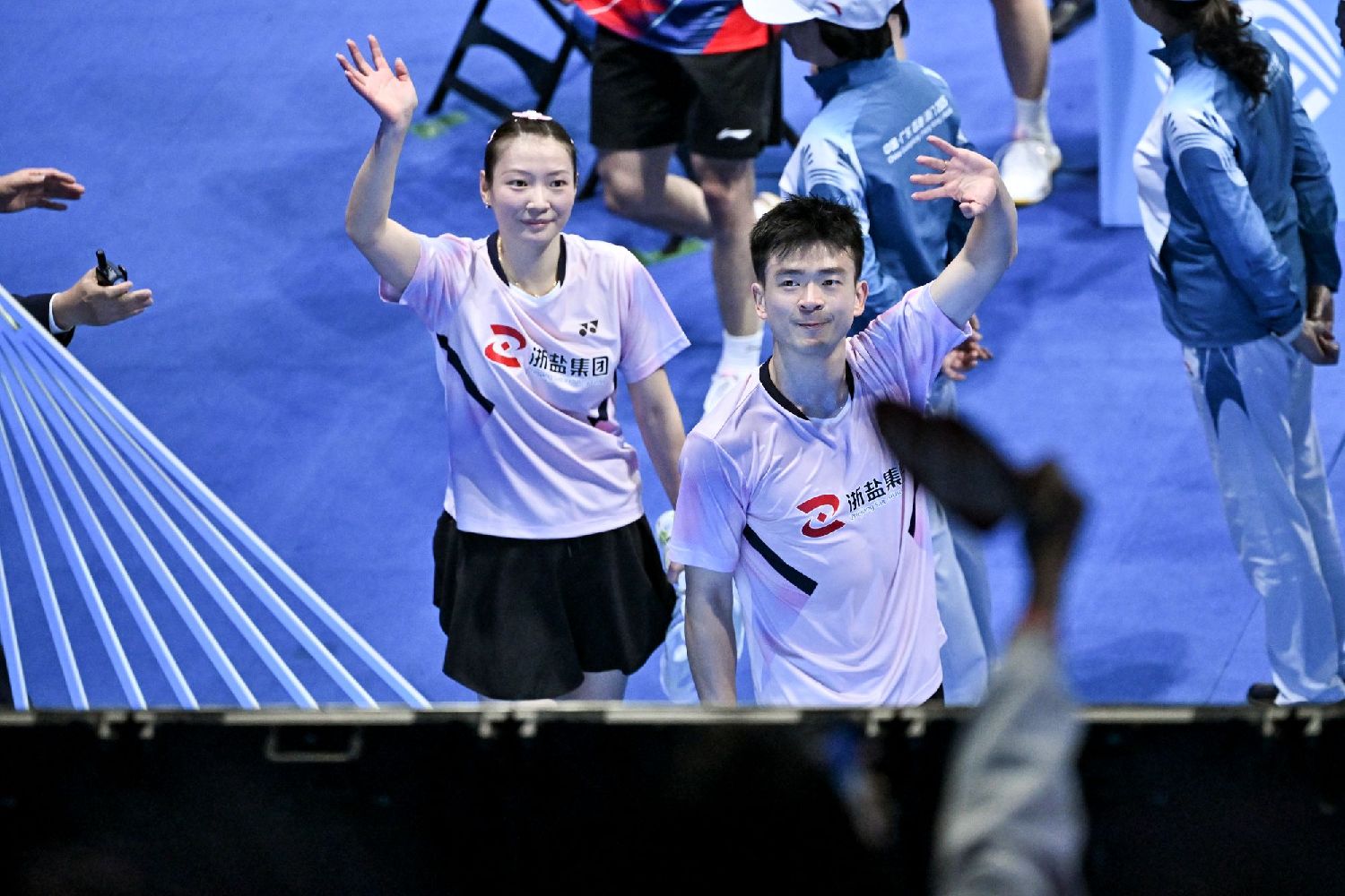11月20日,第十五届全国运动会羽毛球混合双打决赛在广东深圳市体育中心体育馆举行,浙江队郑思维(粉衣前)/黄雅琼夺得冠军。图为郑思维/黄雅琼向观众致意。(图/中新社)