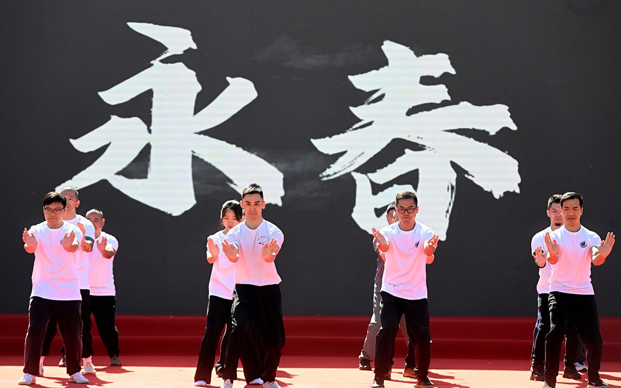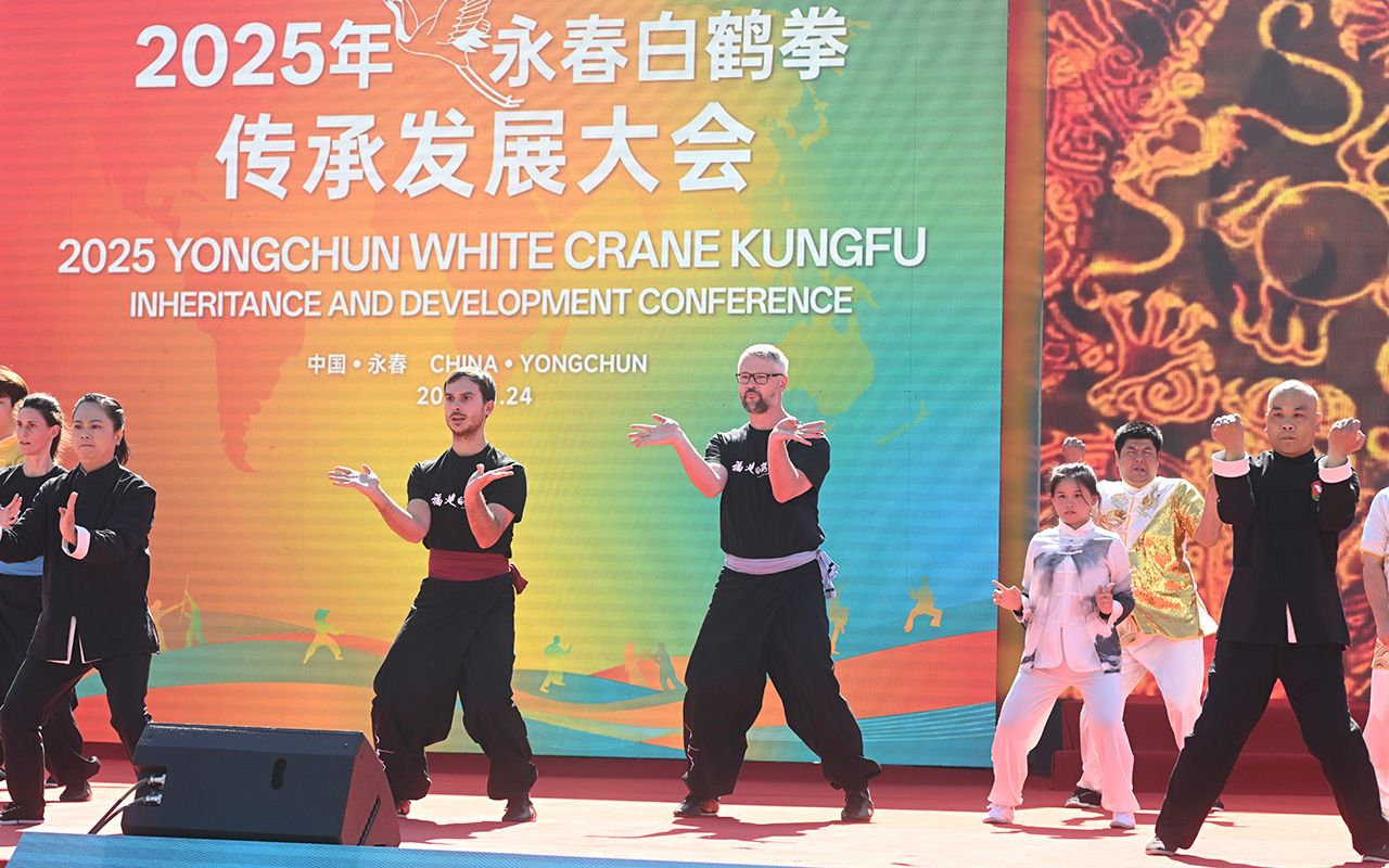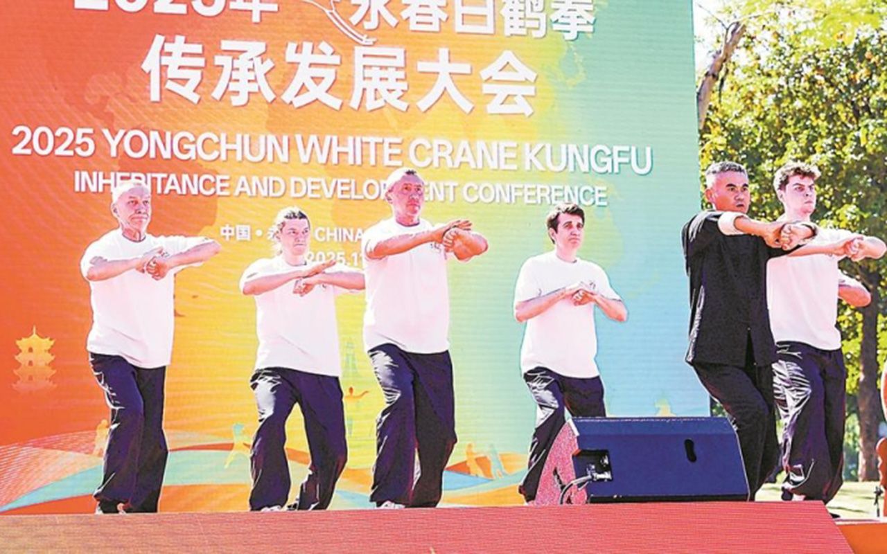11月24日,2025年永春白鹤拳传承发展大会在福建永春举办。来自全球10多个国家和地区的白鹤拳爱好者齐聚“白鹤拳故乡”,以拳为媒、以武会友。白鹤拳发源于中国知名侨乡永春县,有着“东方神拳”的美誉。历经300多年的传承发展,永春白鹤拳已远播全球80多个国家和地区,每年吸引着数千名“洋弟子”前往永春学习。图为大会现场。(中新社)