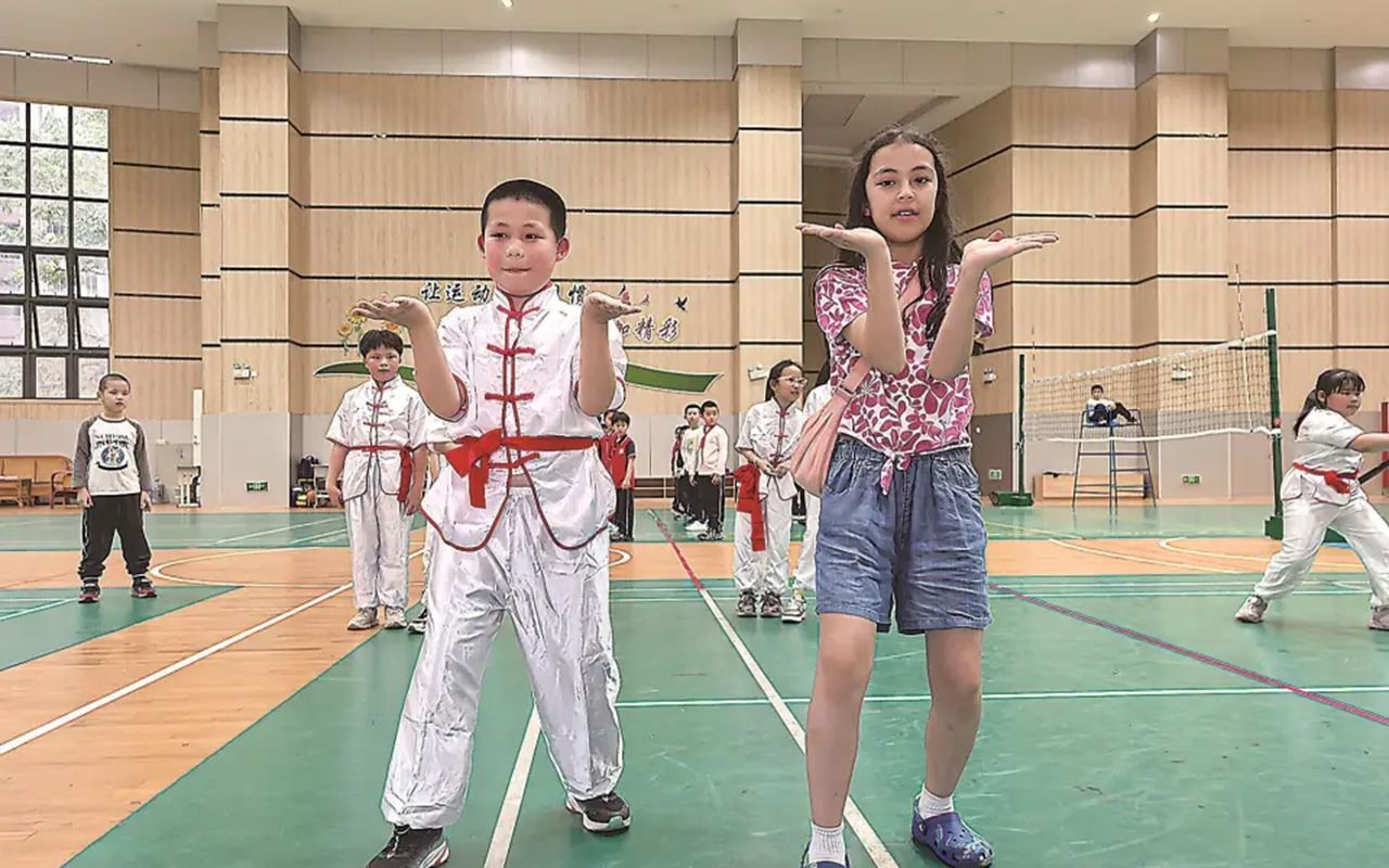 图为洋弟子到福建泉州永春县第三实验小学交流学习永春白鹤拳。(福州《福建日报》)