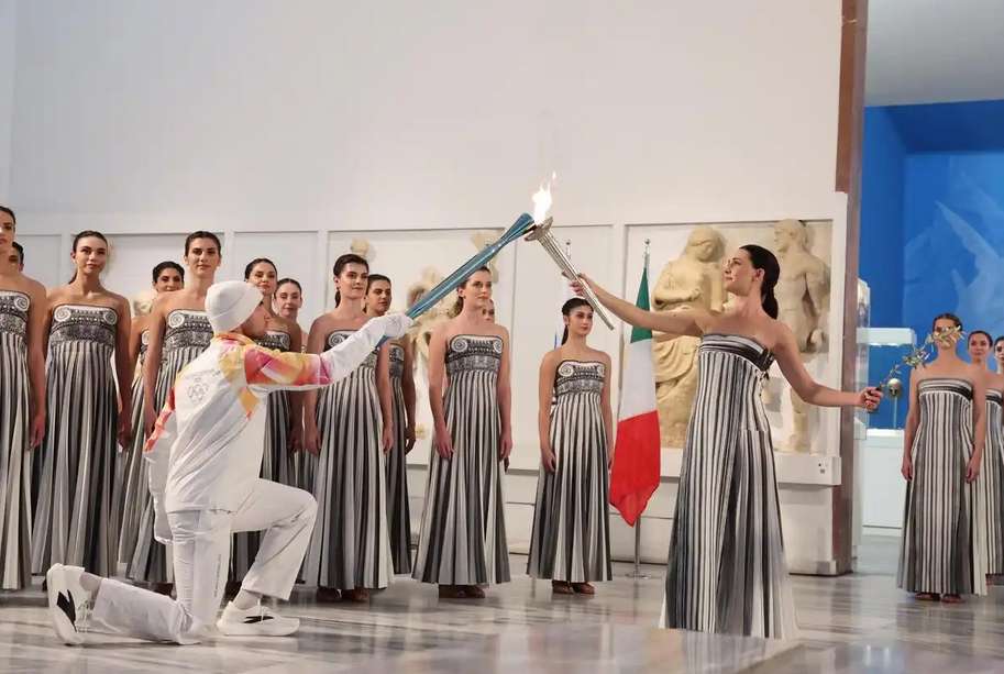 扮演最高女祭司的演员玛丽•米娜点燃第一棒火炬手、希腊运动员盖达齐斯手中的火炬。圣火点燃后,将先在希腊境内传递,并于12月4日在雅典正式移交给米兰冬奥会组委会。
