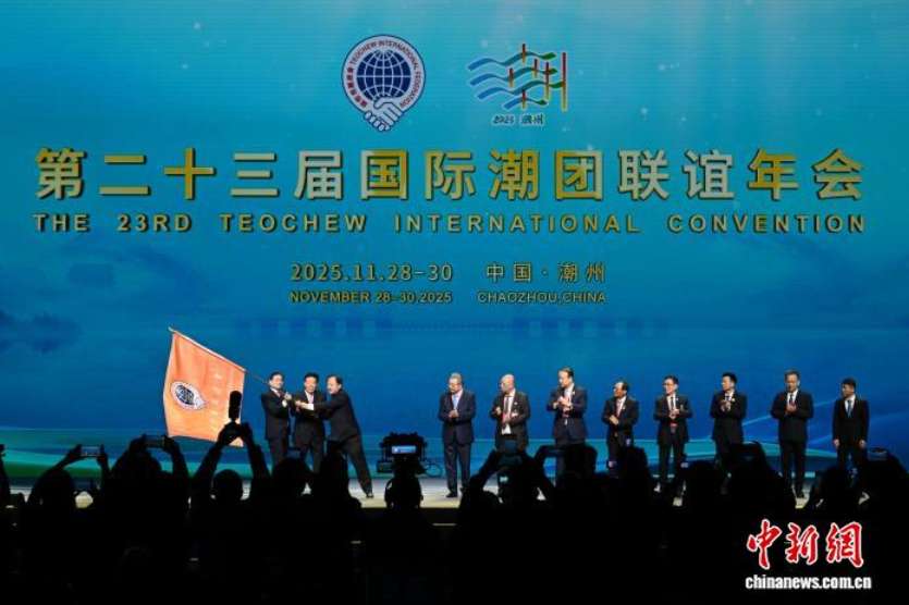 11月30日,第二十三届国际潮团联谊年会闭幕式上举行国际潮团总会会旗交接仪式。(图/中新网)