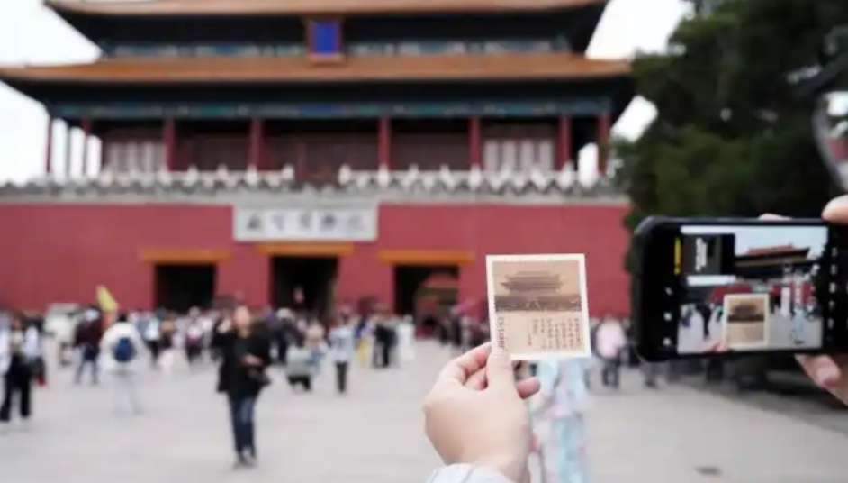 2025年10月10日,北京故宫博物院建院100周年之际,一位游客手持一张故宫藏书票参观打卡故宫神武门。(图/中新社)
