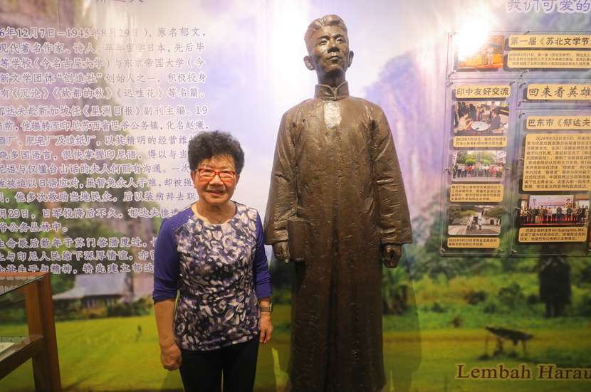 郁达夫纪念馆正中央矗立着郁达夫铜像。展厅一侧的整面展墙按“家园”“婚姻”“求学生涯”“文学创作”“抗战时期”“流亡印尼苏岛”等板块展开,系统呈现郁达夫的一生。展板介绍写道:“郁达夫生命最后数年于苏门答腊度过,长眠于此。他在这片土地上与印尼人民结下深厚情谊,亦留下诸多诗文创作。为纪念其生平与精神,特此建立郁达夫纪念馆。”