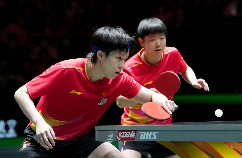 12月3日,中国选手王楚钦(左)、孙颖莎(右)在成都混团世界杯比赛中登场。(图/中新社)