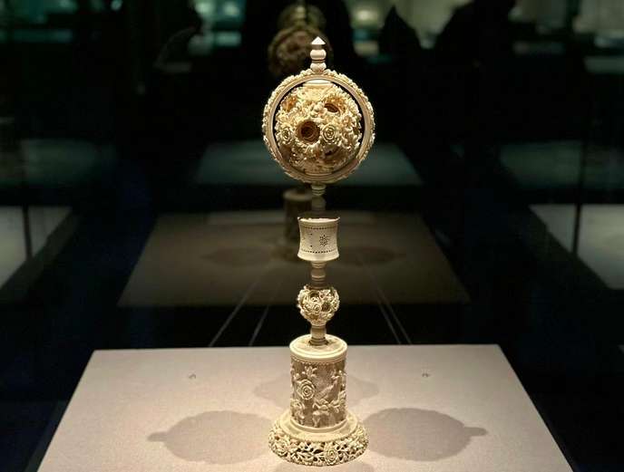 12月4日,“异趣同辉——清代外销艺术珍品展”在上海对公众开放。图为清代象牙雕上下双活多层牙球摆件。(图/中新社)