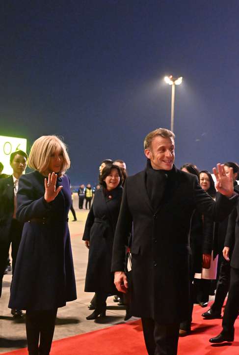 当地时间12月4日晚,法国总统马克龙(右)乘坐的专机抵达成都双流国际机场,开启他本次访华行程第二站。(图/中新社)