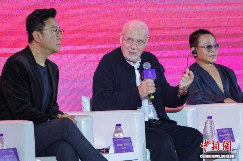 意大利电影制片人、学者、策展人马可•穆勒(中)在第七届海南岛国际电影节“金椰奖”国际评委见面会上回答媒体记者提问。(图/中新网)