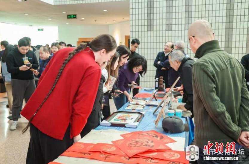 第二届春节文化论坛暨“春节文化与可持续发展”国际学术研讨会7日至8日在北京举行。图为与会嘉宾观看并体验中国剪纸、书法等非遗项目。(图/中新网)