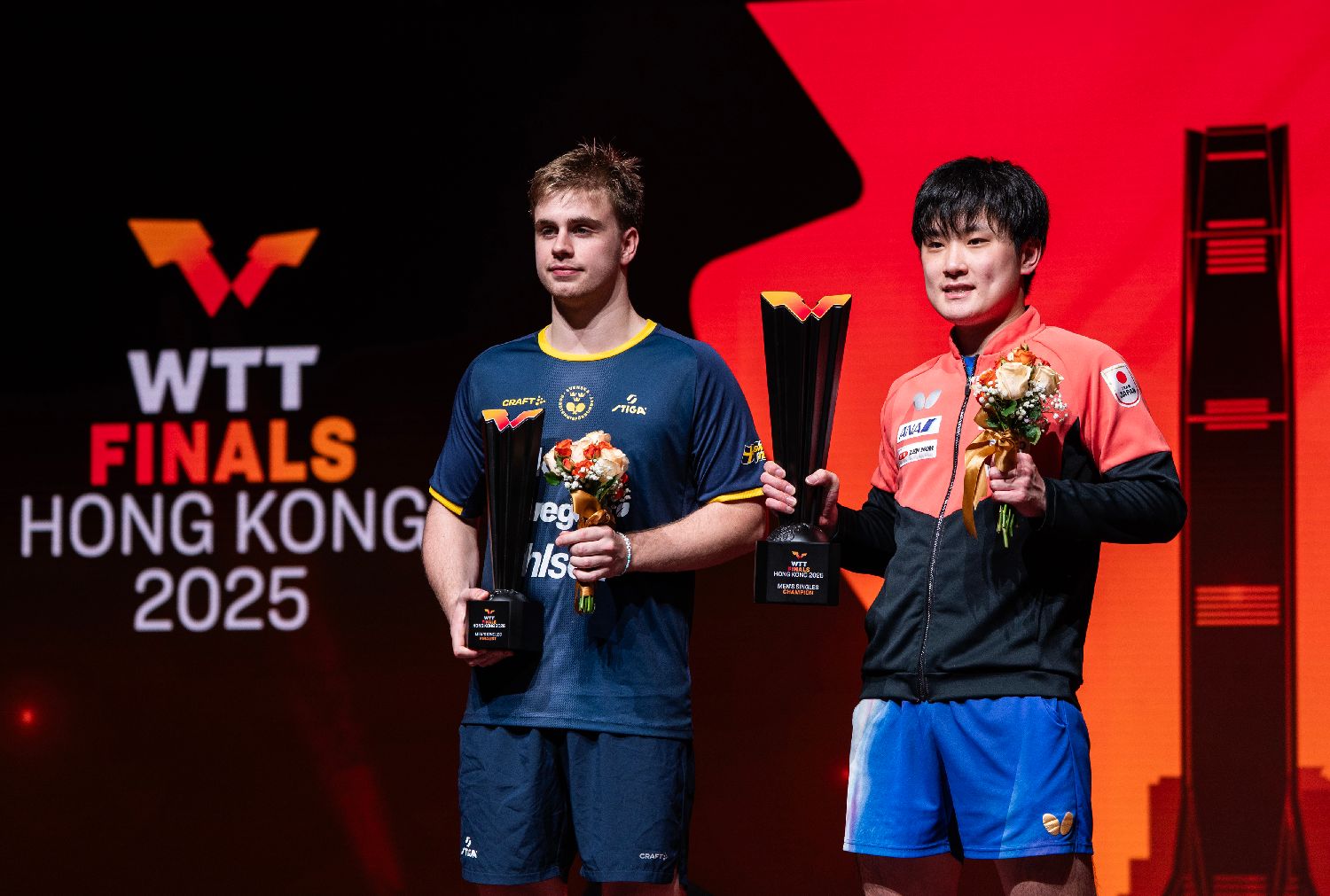 当地时间12月14日晚,世界乒乓球职业大联盟(WTT)香港总决赛在香港体育馆收官。在男单决赛中,日本选手张本智和4:2战胜瑞典选手莫雷加德,获得冠军。图为张本智和(右)和莫雷加德在颁奖仪式上合影。(图/中新社)