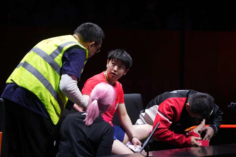 12月13日在香港进行的WTT总决赛女子单打半决赛中,中国选手孙颖莎(中) 因伤退赛,蒯曼晋级决赛。图为孙颖莎在比赛中接受治疗。(图/新华社)