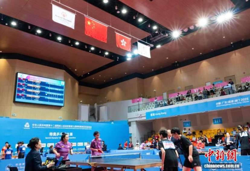 12月6日,全国第十二届残特奥会乒乓球赛事在香港荃湾体育馆拉开帷幕。图为香港队女双组合郑凯晴/刘静怡(紫衣)对阵上海队选手。(图/中新网)