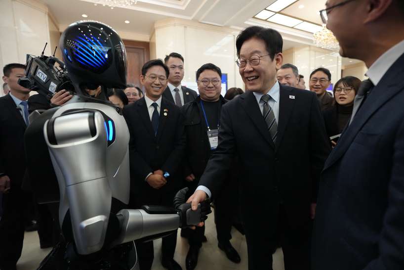 韩国总统李在明1月7日在中国上海出席中韩创新创业论坛,并与中国智元人形机器人握手。(图/中新社)