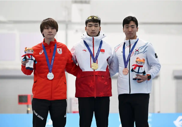 哈尔滨亚冬会速度滑冰项目2025年2月11日收官,冠军中国选手高亭宇(中)、亚军日本选手森重航(左)和季军韩国选手金俊昊在颁奖仪式上。(图/新华社)
