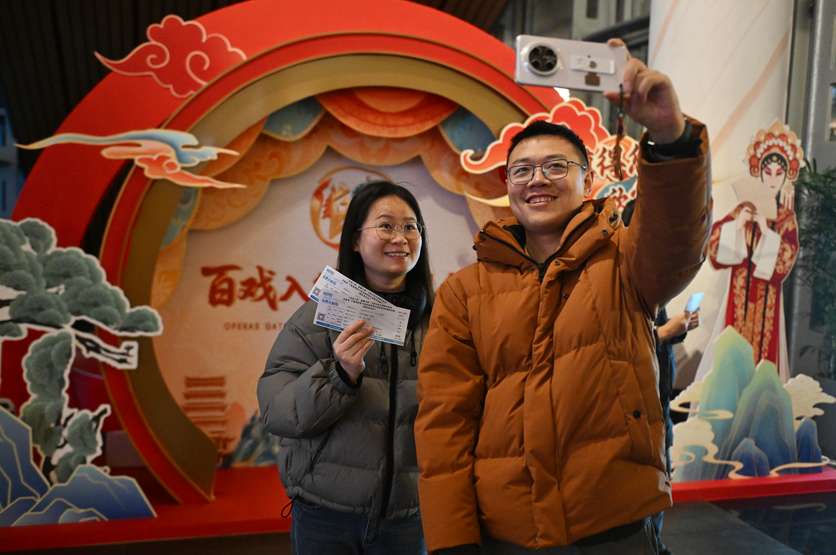 当地时间1月11日晚,在合肥大剧院,观众手拿《穆桂英挂帅》演出票根拍照留念。(图/中新社)
