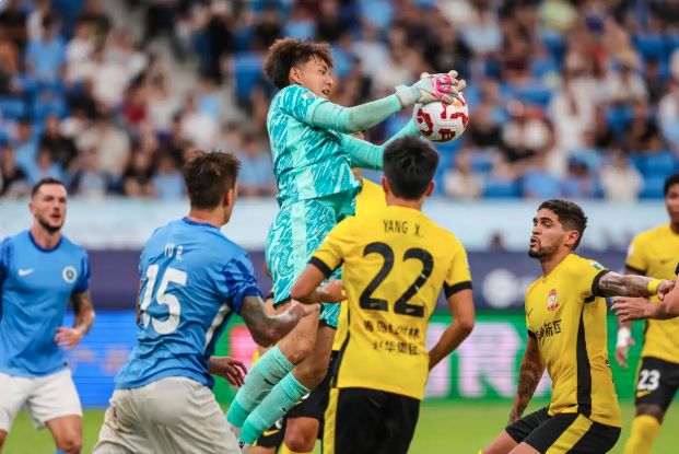 李昊(上)代表青岛西海岸队在中超比赛中扑救。(图/新华社)