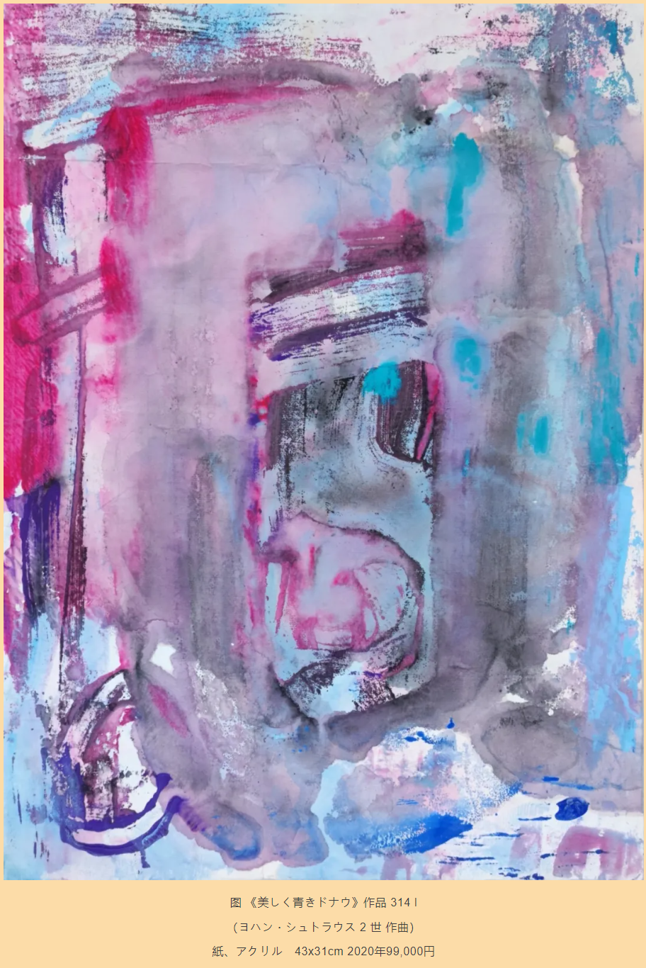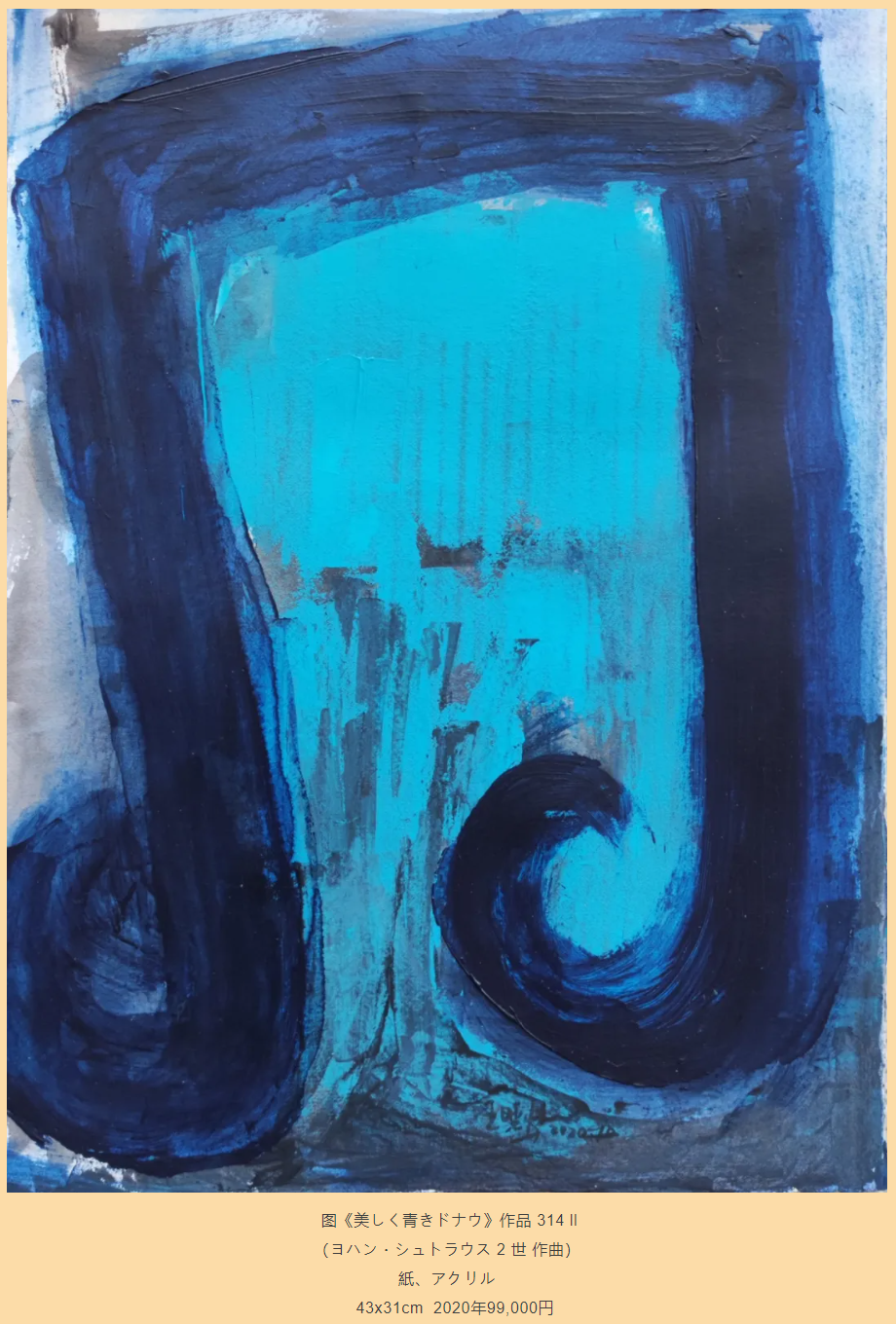 围绕2026年东京多元交响乐团新年音乐会演出曲目《蓝色多瑙河》,王晓鸣共创作了三幅绘画,完成于2020年至2026年之间,媒介涵盖纸本与画布,画幅由较为舒展的尺寸逐渐转向更为凝练的表达。不同年代的作品在色彩明度与笔触节奏上各有侧重,却始终围绕“流动”这一核心展开:有的画面更接近水面般的平缓推进,有的则在细微变化中暗含律动的起伏,使时间仿佛被拆解为一段段可以被观看的舞步。