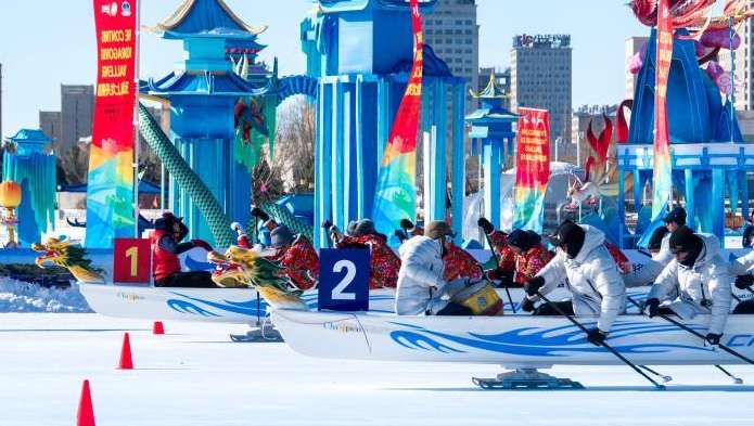 冰上龙舟是一项融合竞技性、团队性、娱乐性的冰上运动,是传统龙舟项目的创新和延伸。它既保留了传统龙舟项目的技巧性和竞技性,又打破了龙舟运动的季节限定。
