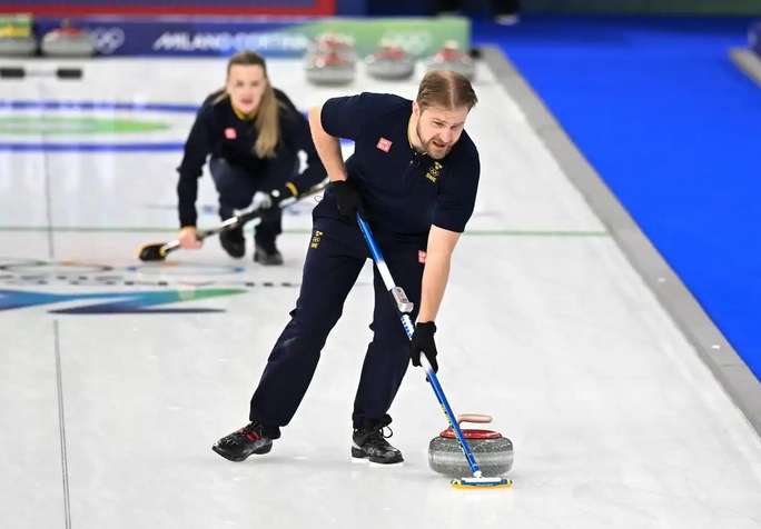 当地时间2月4日,意大利科尔蒂纳丹佩佐的赛场内,瑞典队选手拉斯穆斯·弗拉纳(前)和伊莎贝拉·弗拉纳在对阵韩国队的比赛中。(图/新华社)