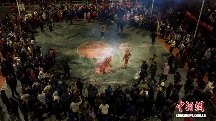中新网山东邹城2月5日电(沙见龙 宋文强)“开门放虎!”夜幕降临,随着广场灯光骤然熄灭,密集的锣鼓声响起。一名身负特制“火甲”的表演者踩上高跷,周身瞬间迸发出数千条金色火线,宛如猛虎现身。与之对峙的“打虎人”手持火捻哨棒,腾挪扑闪间,火星如瀑流泻,照亮夜空。