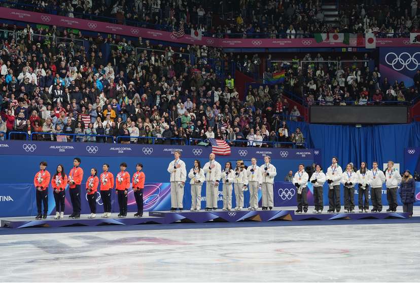 当地时间2月8日晚进行的米兰冬奥会花样滑冰团体赛中,美国队夺冠,日本队获得亚军,意大利队摘铜。图为颁奖仪式现场。(图/中新社)