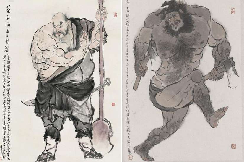 戴敦邦所绘《水浒传》人物鲁智深和李逵。(图/中新社)
