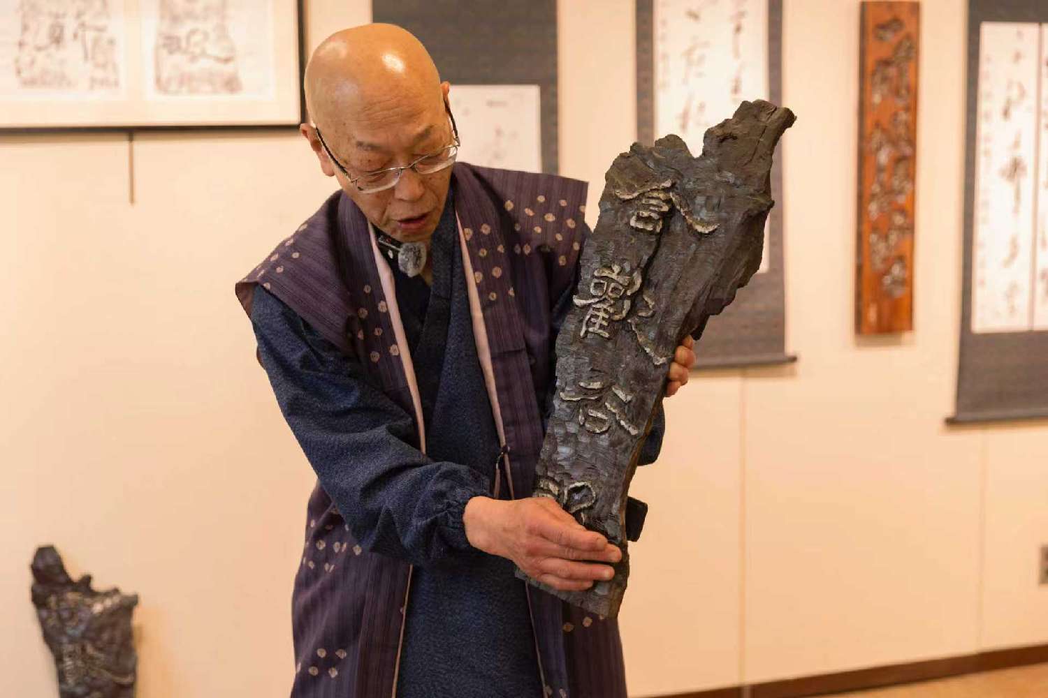 本次展览作品与中华传统文化渊源深厚,其中一件取材自陶渊明《自祭文》“含歡谷汲,行歌負薪”的篆刻作品尤为引人注目。该作以整块柿木一分为二刻成,并与拓本并置展出,充分展现了艺术家对文字意涵、材质结构与空间关系的深刻理解。