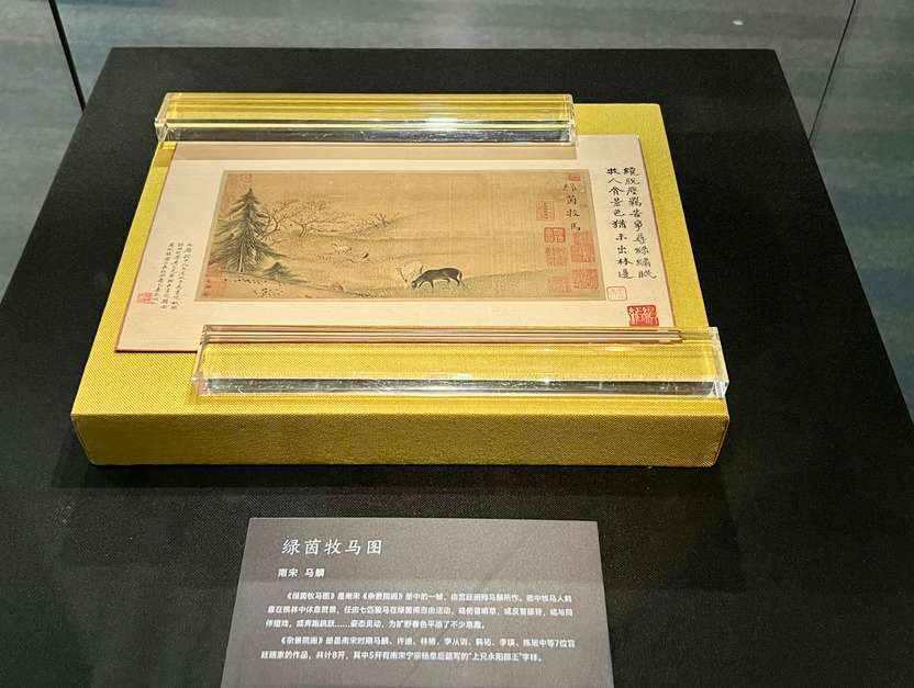 《绿茵牧马图》为中国国家一级文物,由南宋宫廷画师马麟所作。画中牧马人斜靠在桃林中休息赏景,任由七匹骏马在绿茵间自由活动,或俯首啃草,或与同伴嬉戏,或奔跑跳跃……姿态灵动,为旷野春色平添了不少意趣。杜芝明表示,为最大限度地保护文物,该展品仅面向公众展出一个月。