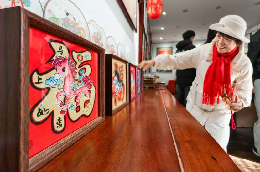 2月11日,天津杨柳青古镇,游客在“玉成号”画庄参观马年主题木版年画。(图/中新社)