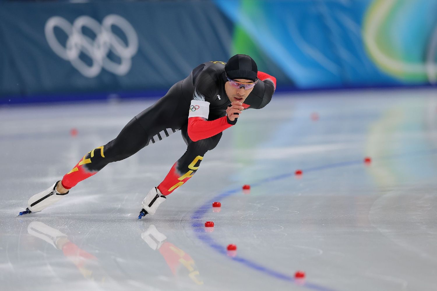 当地时间2月19日,在意大利举行的米兰冬奥会速度滑冰男子1500米比赛中,中国选手宁忠岩夺冠。图为宁忠岩在比赛中。(图/中新社)