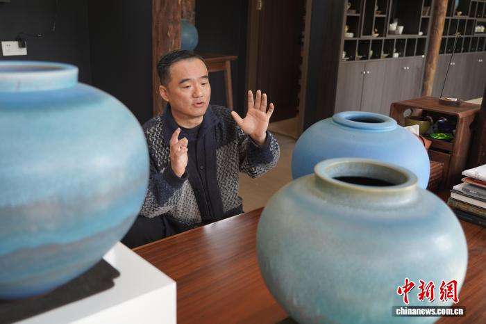 蔡兆庆的工作室不远处,龙门山山脉起伏,湔江水系穿镇而过。来到这里生活后,蔡兆庆把自然景观转化为创作语言。他以当地泥料和矿物为基础,尝试烧制不同釉色,用绿色表现山林,用蓝色呈现江水。为了稳定釉色效果,他花了两年时间反复试验,从泥料配比到釉料调整,最终创作出了“龙门四季”“湔江蓝”“蜀红”等不同釉色的作品。