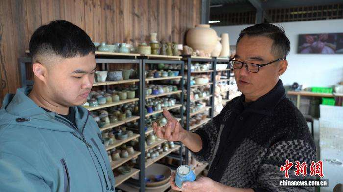 2026年春节,成都彭州海窝子古镇,蔡兆庆与儿子在讨论陶瓷工艺。中新社记者吕杨摄