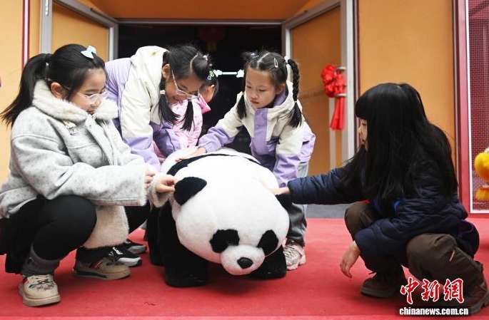 2月23日,在甘肃兰州移动机器人潮玩乐园,扮成熊猫的四足机器人与游客互动。(图/中新网)