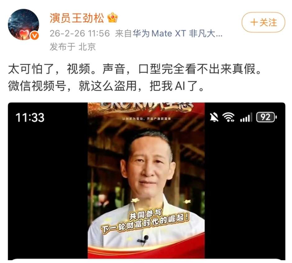 2月26日,中国演员王劲松在个人微博账号发文称,自己的形象被AI盗用生成侵权视频。图为相关帖子及视频截图。(图/上海上观新闻)