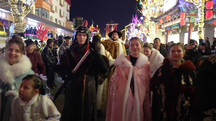 当地时间2月27日晚,身着各式传统服饰的海外友人穿行于辽宁朝阳慕容街。(图/中新社)