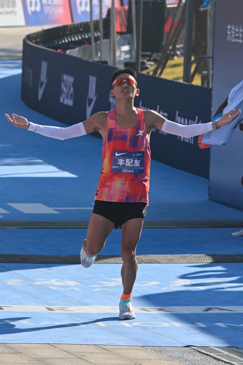 资料图:2025年11月30日,丰配友在上海马拉松比赛中冲过终点。最终,他获得中国籍男子组冠军。(图/新华社)