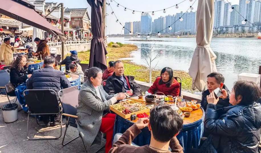 子女陪伴老人在户外用餐。(图/新华社)