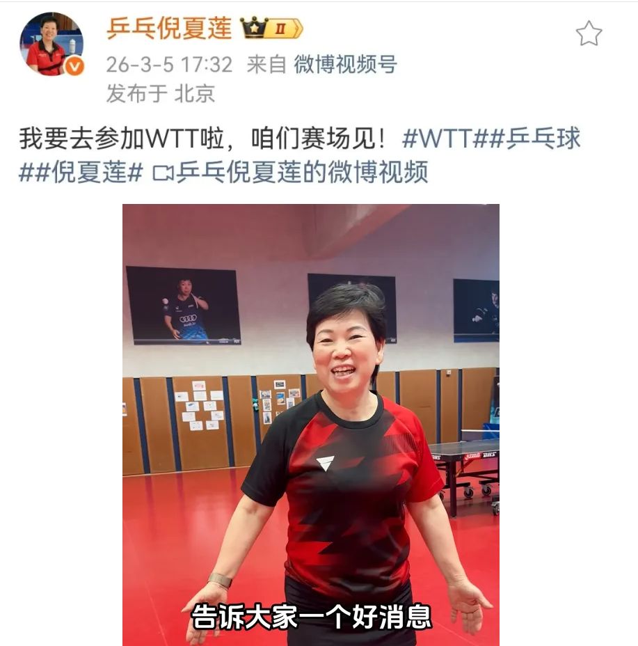 3月5日,63岁“乒乓奶奶”倪夏莲在个人社交平台发了一段视频,并配文称:“我要去参加WTT啦,咱们赛场见!”
