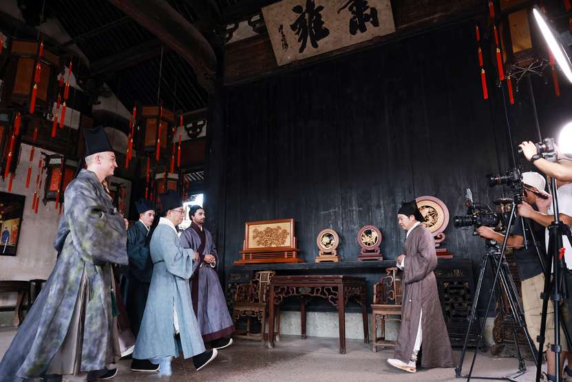 2025年8月24日,在浙江金华东阳卢宅景区,国际友人穿古装戏服,背台词、走机位……本次活动是2025“相聚浙里”国际人文交流活动的系列活动,邀请部分外国博主和友好使者参与以东阳木雕为主题的微短剧拍摄。(图/中新社)