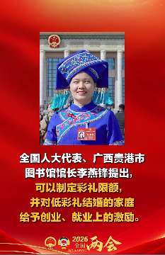 全国人大代表、广西贵港市图书馆馆长李燕锋提出,可以制定彩礼限额,并对低彩礼结婚的家庭给予创业、就业上的激励。