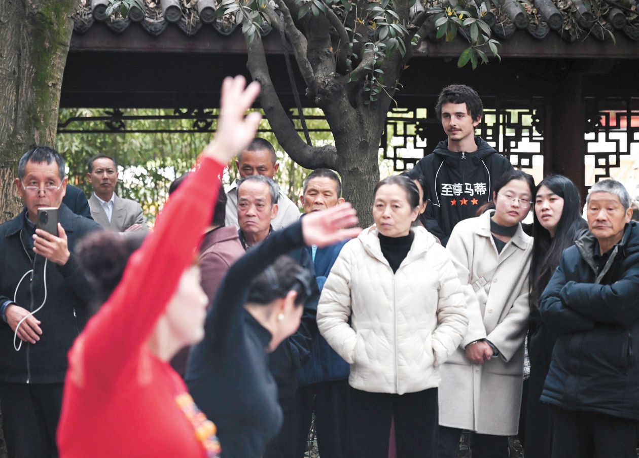 演员提莫西·查拉梅在成都看广场舞。(视觉中国)