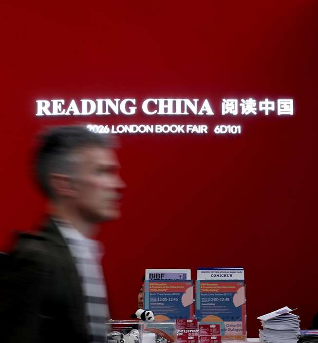 3月10日,一名男子走过英国伦敦书展中国展区。(图/新华社)