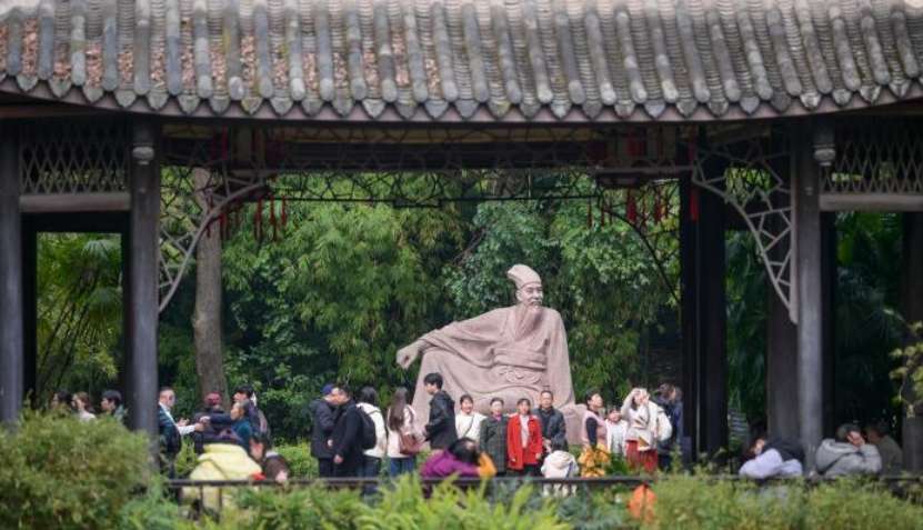 2月15日,农历腊月二十八,四川眉山三苏祠博物馆“古祠新岁苏‘福’过年”系列活动热闹启幕,八方游客齐聚千年古祠,赏浓醇年味、品东坡诗韵、享传统雅趣,共度独具文化底蕴的“苏式”新年。图为东坡盘陀像前打卡的游客。(图/中新社)