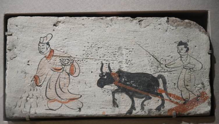 事实上,这些春耕图壁画砖不仅是一件件精美的艺术品,更是一部立体的历史教科书。孙丽娟说,画面中,农夫身着粗布衣物、神情专注,耕牛体态健壮、步伐沉稳,线条简练却极具生命力,既展现了古人对土地的敬畏、对劳动的热爱,也折射出魏晋时期河西地区相对安定、农业繁荣的社会风貌。
