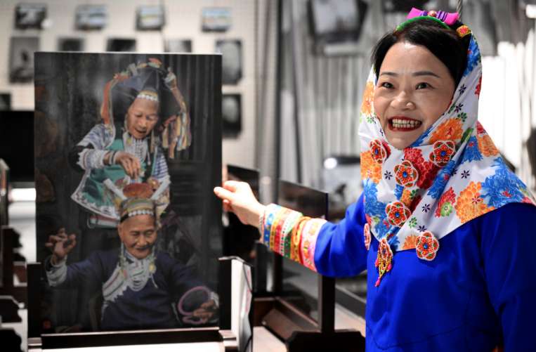 4月15日,身着传统惠安女服饰的张秋霞在位于福建省惠安县的工作室介绍她的影雕作品。(图/中新社)