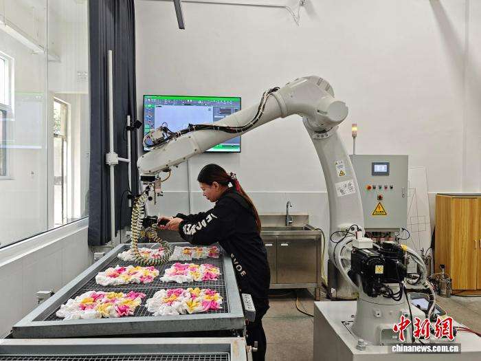 “我们坚持‘智能注染+手工扎花’的模式,既通过机器人保证了颜色统一度和生产效率,又保留了手工工艺的个性化温度。”钱丽霞表示,这一创新让扎染作品更广泛地走进大众生活。