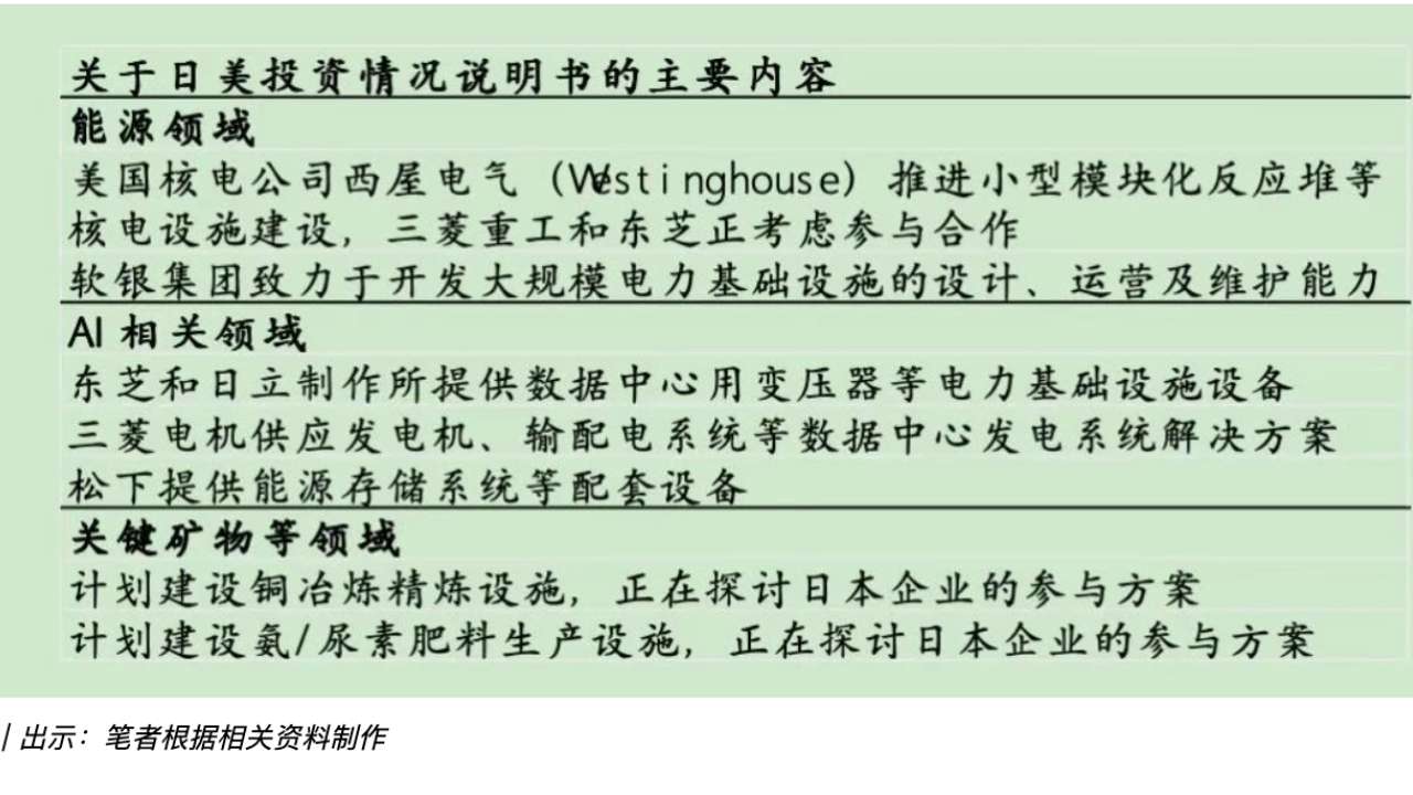 10月28日,就关税协议中日本方面提议的5500亿美元对美投资一事,日美共同发布了一份汇总了候选投资项目的联合文件。该文件涉及能源、人工智能、关键矿产生产等领域的21个项目,三菱重工业、三菱电机、东芝、日立、松下等公司表示有兴趣参与。